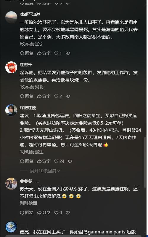 有网友说苏倩就是"白嫖", 买衣服旅游完再退, 也有人说商家卖二次货在先凭啥不让退, 还有人觉得双方都有问题但工厂泄露隐私最不该。