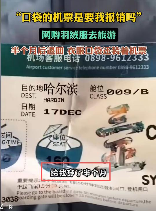 第二天她就带着这件衣服去哈尔滨了, 飞机落地穿上, 登机牌随手塞口袋里, 她说就穿了这么一次, 从机场到酒店那段路, 之后七天在哈尔滨玩, 衣服就没再动过。
