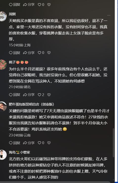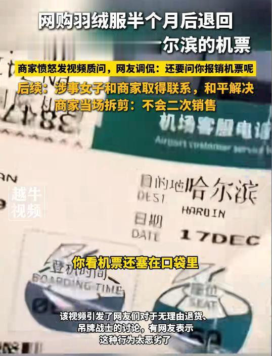 苏倩坚持说自己没错, 退货在7天无理由范围内, 吊牌断了让她怀疑是二次销售, 这理由站得住脚, 在哈尔滨没寄回是因为还在玩, 登机牌落口袋是真没注意。