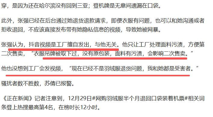 12月29日, "网购羽绒服半个月退回口袋装着机票"上了热搜第4, 挂了12小时, 话题下面吵翻了天, 有人骂苏倩, 有人骂商家, 还有人骂淘宝规则有漏洞。