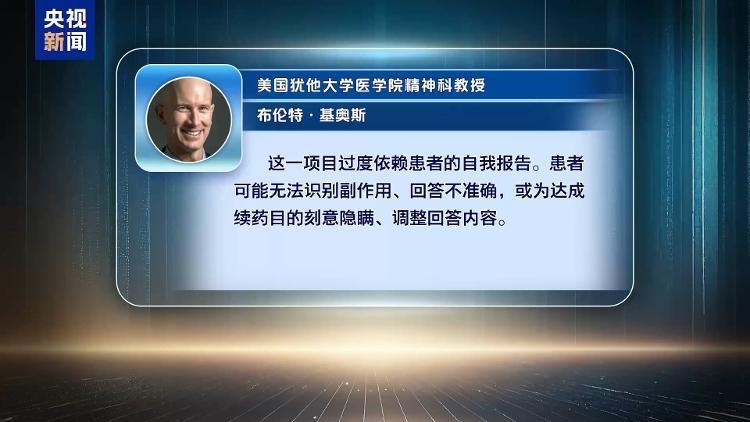 美国犹他大学医学院精神科教授布伦特·基奥斯质疑道,“这一项目过度依赖患者的自我报告。患者可能无法识别副作用、回答不准确,或为达成续药目的刻意隐瞒、调整回答内容。”