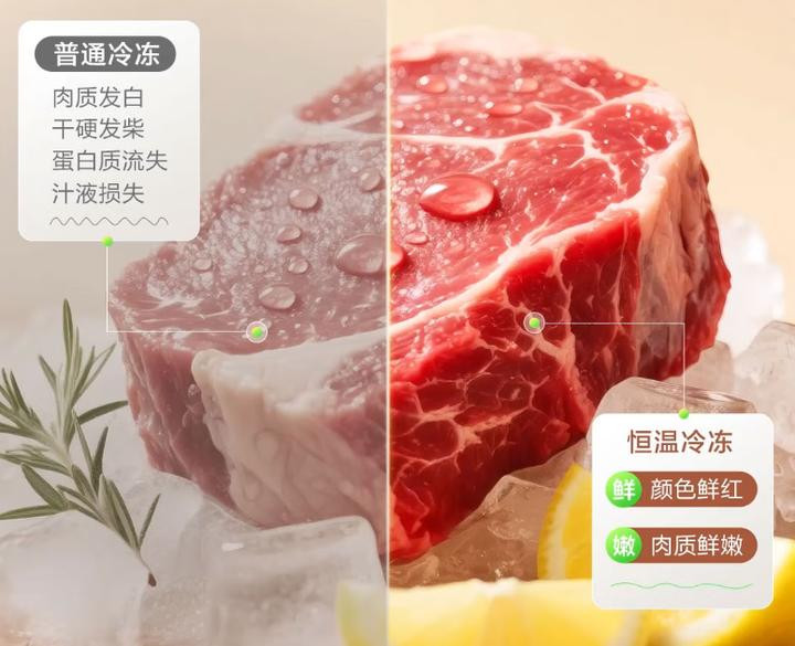 冷冻区 :智能恒温技术(温度波动<1℃),冻肉30天解冻无血水,细胞损伤率降低70%,口感如初。