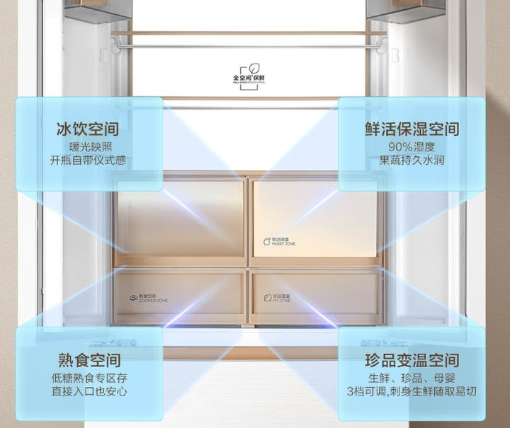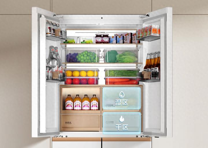 冷藏区 :阻氧干湿分储(湿区90%湿度锁水,干区45%防潮),果蔬存15天水润如初,干货半年不返潮;